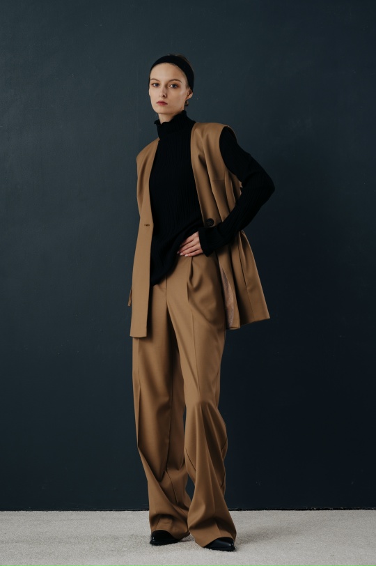 Брюки палаццо со стрелками, прямые от бедра. Спереди мягкие складки на талии, боковые карманы, шлевки на поясе. Длина по боковому шву 113 см