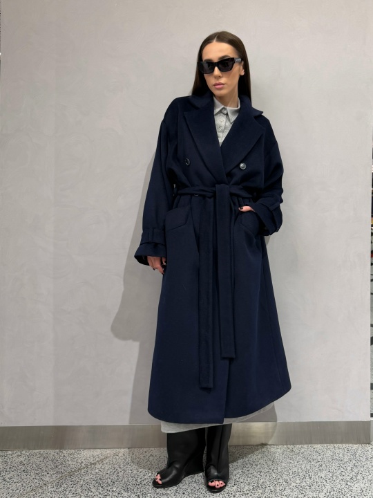 Пальто двубортное из плотного драпа с шерстью на поясе. Пальто прямого силуэта со шлицей на спинке, рукав втачной, плечо спущенное, воротник отложной с лацканами. Застежка двубортная на пуговицы. Карманы прорезные с листочкой. По низу рукава - хлястики, есть возможность делать рукав уже на запястье.
