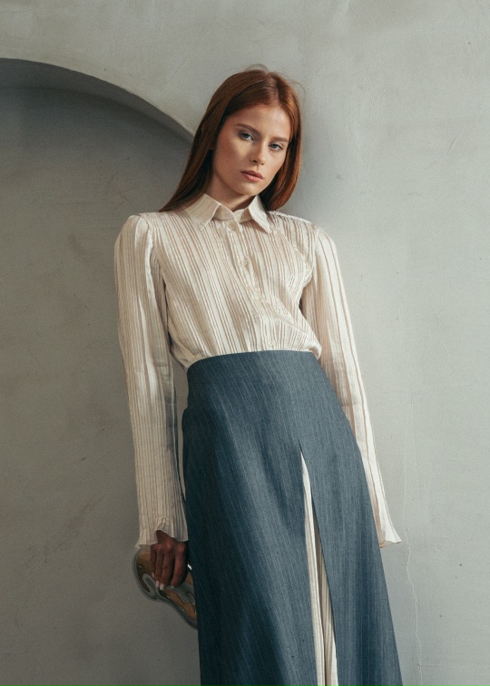 Рубашка из вискозного гофре. Отложной воротник на стойке, расширенный к низу рукав, центральная застежка на пуговицы.