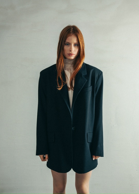 Жакет прямого силуэта, легкий оверсайз, прорезные карманы с клапанами, застежка на одну пуговицу.
